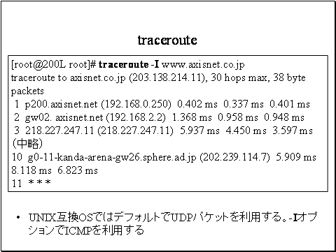 tracerouteはUNIX互換OSのコマンドです。存在目的・機能はMicrosoft OSのtracertと同じです。