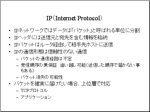 IPの通信は信頼性のない通信です。IPパケットの通信経路は不定です。その時点で1番最適と判定した経路を利用します。