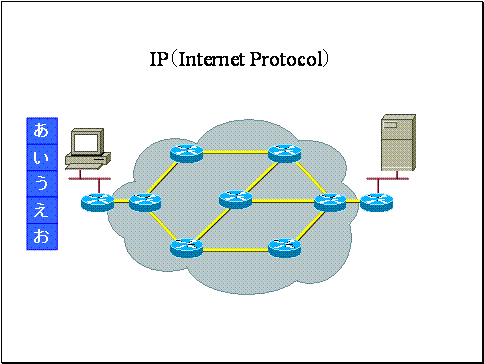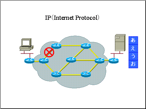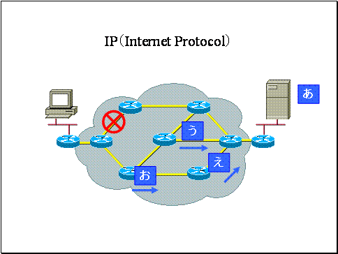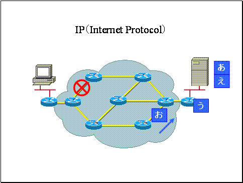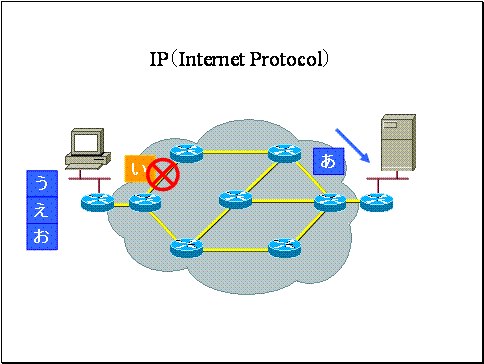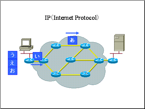 ここで「あいうえお」というストリームをIPパケット「あ」「い」「う」「え」「お」に分割して送信しました。