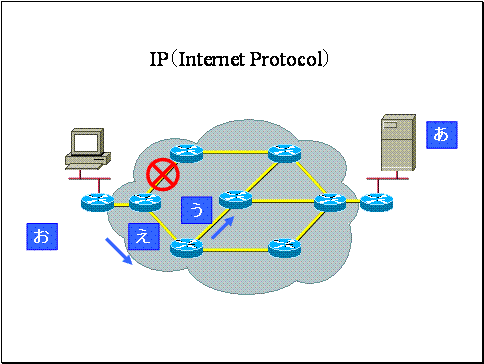 通信断のような障害が更に発生していなくても、混雑状況によっても最適経路判定は変化します。後から送り出された「え」は「う」とは異なる経路を利用しました。ネットワークの最適経路は時々刻々と変化していますので、このような事が起こります。