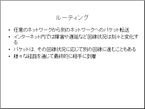 既に述べたように、インターネット内では障害や遅延など回線状況は刻々と変化しています。パケットは、その利用する回線状況に応じて別の回線に進むこともあります。様々な経路を通じて最終的に相手に到着します。