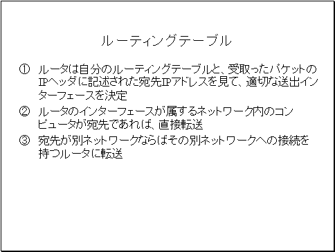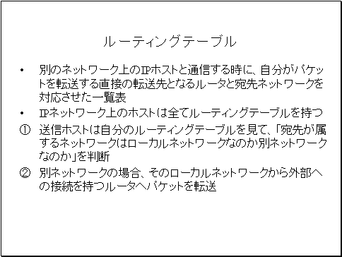 ルーティングテーブルとは、別のネットワーク上のIPホストと通信する時に、自分がパケットを転送する直接の転送先となるルータと宛先ネットワークを対応させた一覧表です。