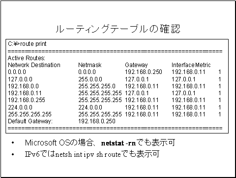 Microsoft OSの場合、routeコマンド・netststコマンドでも確認できます。