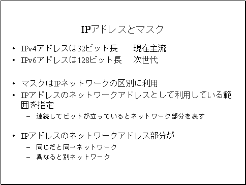 また、ネットワーク層のアドレスである、IPアドレスとマスク・IPルーティング、について学びます。