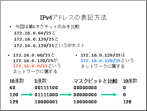 比較すると、172.16.0.60/25と172.16.0.120/25が172.16.0.0/25というネットワークに属すること、172.16.0.129/25は172.16.0.128/25というネットワークに属することが判りました。