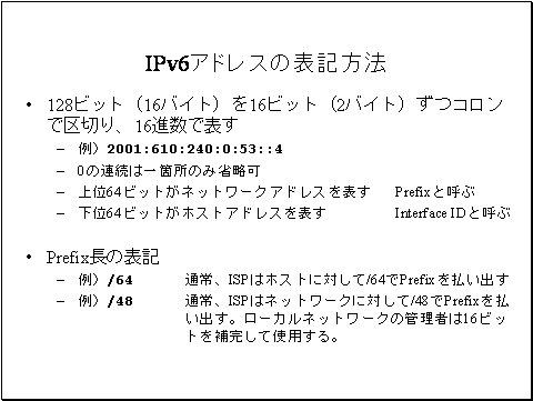 IPv6アドレスでは、2001:610:240:0:53::4のように、128ビット(16バイト)を16ビット(2バイト)ずつコロンで区切り16進数で表します。16進数ですから、二千四ころ、六百十ころ、とは読みません。ニゼロゼロイチ コロ ロクイチゼロ コロ のように読みます。0の連続は一箇所のみ省略可能です。