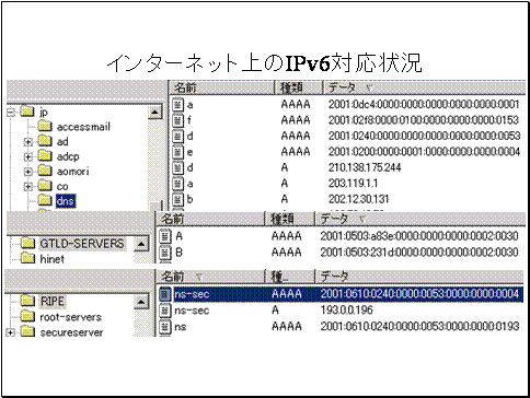 現在、インターネットではまだIPv6で通信できる範囲はわずかです。まだrootサーバが対応していません。しかし、jpドメインを管理するDNSサーバやGTLDサーバのうちAとBはIPv6に対応しています。また、ヨーロッパ・アフリカにおける地域インターネットレジストラ・IPアドレス管理組織のRIPE NCCのDNSサーバはIPv6に対応しています。