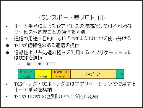 トランスポート層のプロトコルにはTCPとUDPがあります。通信の用途・目的に応じてTCPまたはUDPを使い分けます。TCPは信頼性のある通信を提供します。信頼性よりも処理の軽さを利用するアプリケーションにはUDPを選択します。UDPを利用するアプリケーションプロトコルにDNS・TFTP・DHCPがあります。