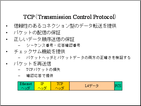 TCP(Transmission Control Protocol)は、信頼性のあるコネクション型のデータ転送を提供します。TCPの提供する信頼性とは、