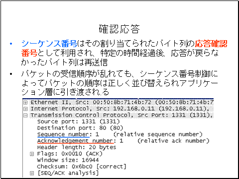 応答とは、Acknowledgementの事です。TCPでは送信側は受信側からの応答を期待して通信データを送信します。受信側は通信データを受信すると「届きました。」と応答を送信側に対して行います。送信側は受信側からの応答をかくにんして通信の正常性を確認します。
