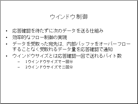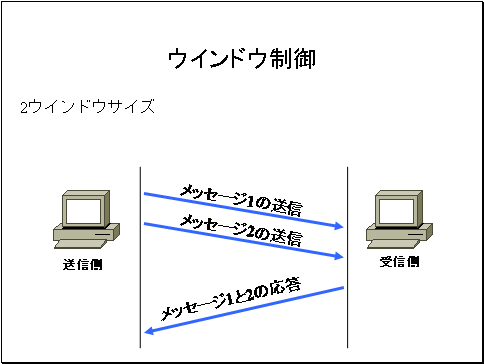 ウインドウ制御とは応答確認を待たずに次のデータを送る仕組みです。ウインドウ制御は効率の良い通信を実現します。TCPでは通信データを受信すると応答確認を送り返します。ウインドウ制御はこの確認応答の仕組みを利用しています。