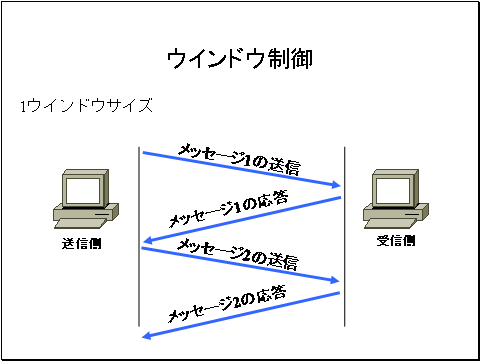 最初のウインドウサイズはコネクション確立時に受信側から提示されます。1ウインドウサイズの場合、送信側はパケットを送るたびに確認応答を待ちます。