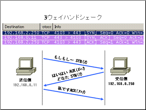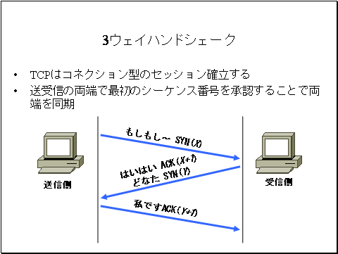 TCPが確立するコネクション型のセッションは3ウェイハンドシェークで確立します。