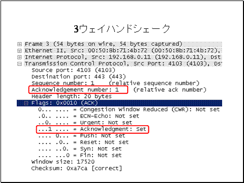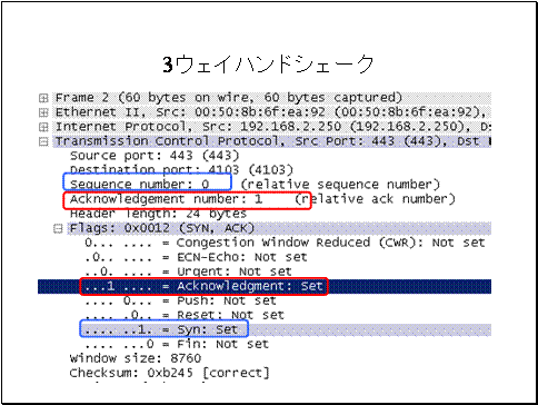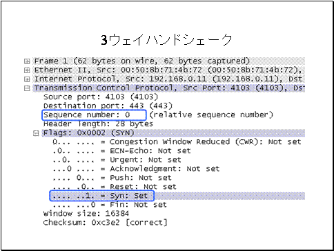 これは送信側が受信側に対して送信した一つ目のパケットです。TCPヘッダの中にフラグ領域があり、SYNビットのみに1が立っています。このビットによってこのパケットがSYNパケットである事が判ります。