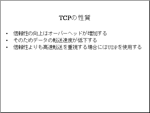 TCPのメリットは信頼性です。しかし信頼性の向上はオーバーヘッドの増加を生みます。そのためデータの転送速度が低下します。