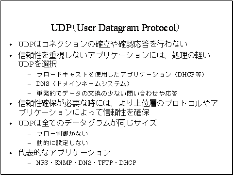 トランスポート層のもうひとつのプロトコルがUDPです。UDPはコネクションの確立や応答確認を行いません。そのためオーバーヘッドがTCPより少ない通信が可能です。信頼性を重視しないアプリケーションには、処理の軽いUDPを選択しています。例えば、DHCP等のブロードキャストを使用したアプリケーションや、DNS(ドメインネームシステム)のような単発的でデータの交換の少ない問い合わせや応答に使用しています。