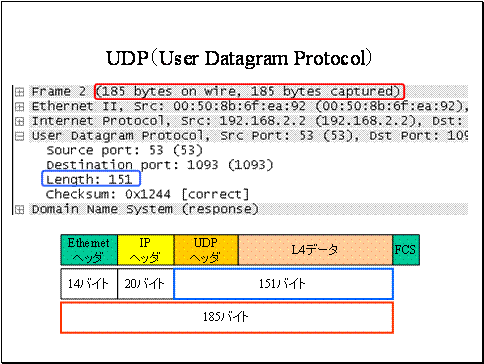 UDPヘッダ内にデータグラム長が151バイトと記述してあります。計算どおりです。