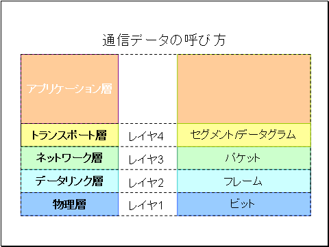 ネットワーク階層モデルで各階層でのデータの呼び名があります。ここにも「パケット」という語が出てきます。