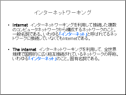 英語の場合、冠詞によって一般名詞と固有名詞を使い分けしているのでInternetThe internetを区別できますが、日本語では「インターネット」という場合、The internetをさす場合が多いでしょう。日本語では「ジ・インターネット」も「インターネット」も区別がつかないので、
