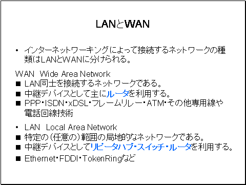 インターネットワーキングによって接続するネットワークの種類は、主にLANWANに分けられます。
