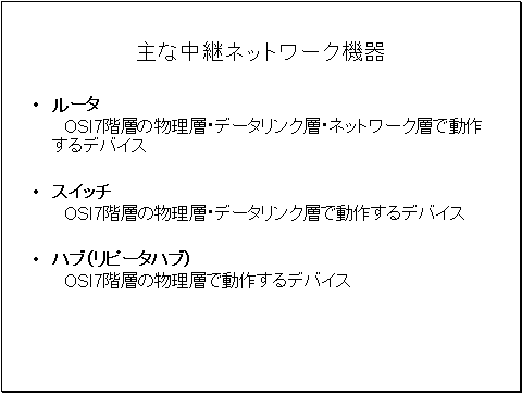 インターネットネットワーキングで使用する主な中継ネットワーク機器には、ルータ・スイッチ・リピータハブがあります。