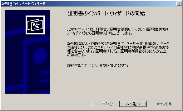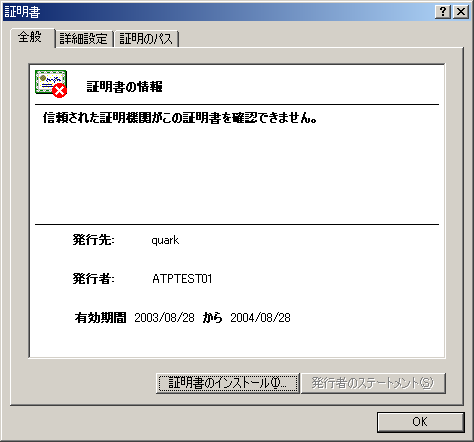 8. [証明書] ダイアログ ボックスで、[証明書のインストール] をクリックし、証明書のインポート ウィザードを起動します。