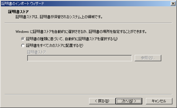 10. [証明書の種類に基づいて、自動的に証明書ストアを選択する] をクリックし、[次へ] をクリックします。