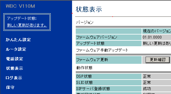 この状態表示のページは自動書き換えが行われていて数十秒に一回書き換わる。(30秒のようだ)ファームウェアの最新版がサーバに用意されると、左側のメニューのV110M簡単設定の間あたりにファームウェア更新のリンクが出てくる。
