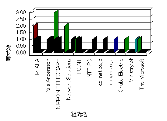 組織ユーザーにインターネット接続を提供する、商用または非営利団体、学術・行政機関などの、インターネット ドメイン で識別される団体や組織です。Microsoft Site Server Analysis は同じ組織に登録されたすべてのドメインを 1 つの組織としてグループ化します。ドメインがデータベースで使用できない場合は、1 つのインターネット ドメインが 1 つの組織を識別するのに使用されます。